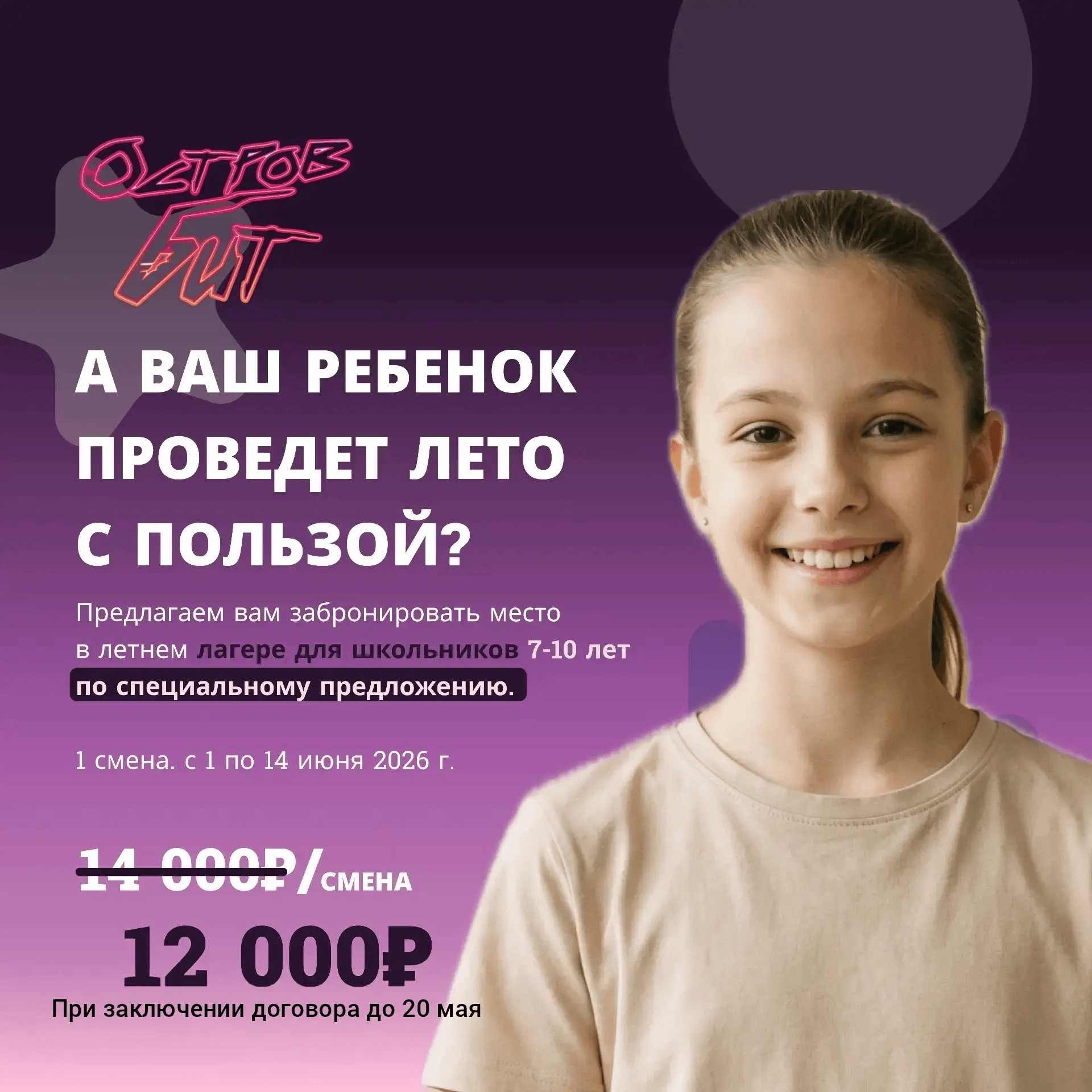 Подростки: 12 000 ₽ / смена (при оплате до 20 мая — 11 000 ₽).